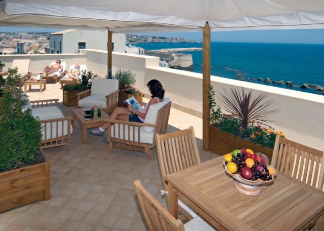 L’albergo Domus Mariae sorge sulla passeggiata del lungomare di levante, uno dei luoghi di Ortigia più belli per godere delle albe e dei tramonti sul mare aperto.